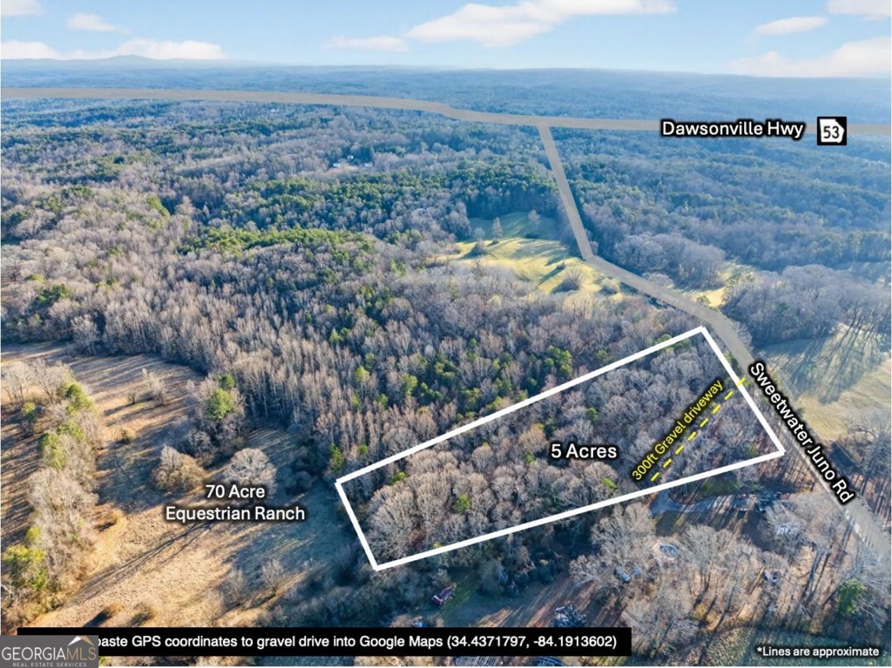 *The real estate agent is the seller/owner* FLAT 5 Acre tract in Dawson County with a 300ft driveway already in place! Secluded off of quiet, paved county maintained Sweetwater Juno Road, where Agricultural zoning requires a minimum of 5 acres - never worry about high density subdivisions anywhere near here. No nosy neighbors remotely in sight, or an HOA dictating what you can or cannot do on your own property! Perfect for absolutely ANYTHING - slab home, manufactured home, basement home, barndominium - YOUR CHOICE! Accessory buildings ALLOWED - build a barn for your animals or agricultural business. Sick of your adult children living at home? Or have nowhere to put your mother-in-law? Or want passive income from hikers, hunters or Dawson Motor Sports? Problem solved - you can have TWO residential structures on the property! The main house must be at least 800 sq ft, the secondary one must be at least 400. Uniquely located - almost in the National Forest, yet practically next door to the Atlanta Motorsports Park where multi-millionaires from all over the country store and drive their Porches and Lamborghinis. Travel often? Only 55 minutes to the North Springs MARTA station. For those that wish to check the site out on their own - please note the +/- 300ft gravel drive extends onto another property, but is not used by that property or any other property. There is a steel wire cable across the gravel drive at the edge of the property line. Feel free to park your vehicle on the gravel drive while you walk the property. There is a partial line wire fencing along southern road frontage, gravel drive and northeastern property line with full fencing along rear (eastern) property line (see photos). Large deer stand near rear of property for immediate use overlooking open area of Club Moss. Rear of property backs up to a $3M+ 70 acre equestrian ranch. Property will be served by well and septic (selected by buyer). Full perimeter is flagged, with rough trimmed foliage to navigate at your leisure (don't forget your boots and long pants). Copy and paste GPS coordinates to gravel drive into Google Maps (34.4371797, -84.1913602). Owner financing is available. Terms: 10% down, 10% interest rate, 3yr term/balloon (negotiable). Land or residential trade also considered.