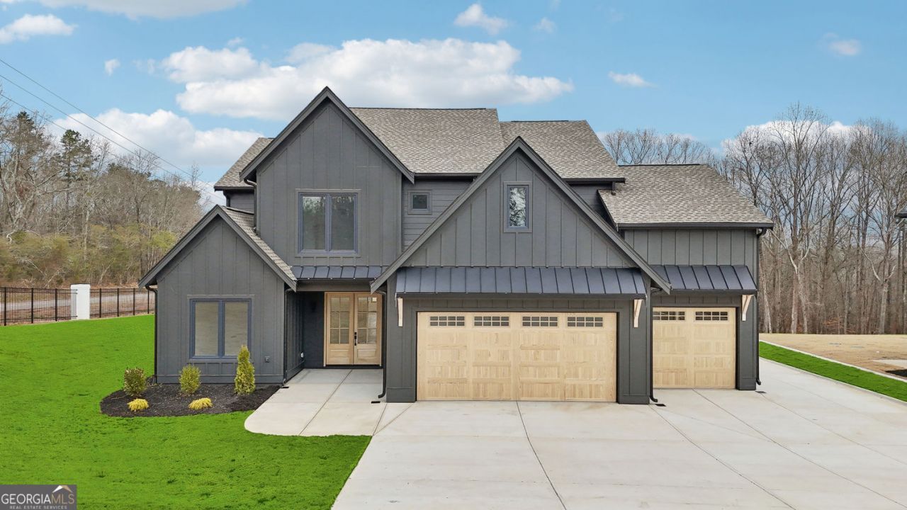 Set on a private level lot, this exceptional 2025 new construction residence offers over 4,272 square feet of thoughtfully designed living space in one of Auburn's most sought-after luxury communities. With 4 bedrooms and 4.5 bathrooms, this home seamlessly blends architectural sophistication with modern comfort. From the moment you enter, the home makes a striking impression with epoxy-finished foyer floors, soaring 10-foot ceilings, vaulted architectural accents, and 7-inch French oak hardwoods throughout. The dramatic two-story family room is flooded with natural light and opens effortlessly to the outdoors through an expansive 15-foot sliding glass door, creating a seamless indoor-outdoor living experience. The chef's kitchen is both refined and distinctive, featuring live-edge countertops, an oversized statement island, custom cabinetry, premium gas appliances, a farmhouse sink, floating shelves, and a well-appointed butler's pantry-perfectly positioned for entertaining and everyday living. The main-level primary suite serves as a private retreat, complete with a spa-inspired bath featuring a freestanding soaking tub, a walk-in shower with a rain showerhead, dual vanities, and a custom walk-in closet with built-in shelving. A formal dining room and office on the main level provide an elegant space for gatherings, while the functional mudroom with laundry and three-car garage enhances daily convenience. Upstairs, a spacious media room or secondary living area offers flexibility for relaxation or movie nights, accompanied by three additional ensuite bedrooms, each designed with comfort and privacy in mind. Outdoor living is a true highlight of this home. The covered porch is thoughtfully designed with kitchenette hookups, making it ideal for entertaining, and offers ample space for a future pool. The backyard is ready for personalization and supported by a full irrigation system for easy maintenance. An extended driveway and an additional utility/workshop garage with a roll-up door provide ample storage and parking. Additional features include European-style tilt-and-turn windows, spray foam insulation, pre-wired security, and high-performance construction elements throughout-reflecting a commitment to quality, efficiency, and long-term comfort. Ideally located near Hamilton Mill and I-85, this remarkable home offers convenient access to shopping, dining, and major commuting routes, delivering refined luxury living in a premier setting. Ask about our preferred lender program with rates starting at 4.25%