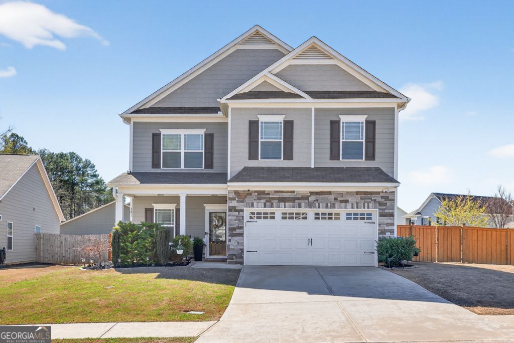 Nestled in the charming Creekside Village neighborhood of Hoschton, this beautiful 4-bedroom, 2.5-bath is waiting for you to make it your home. As you step inside to a welcoming entryway you will be greeted with beautiful hardwood floors throughout the main level, dining room, spacious living room with an open view to the kitchen. This stunning kitchen will be great for family meals and plenty of room to entertain guests with the beautiful Island, white cabinets, granite countertops and so much counter and cabinet space. As you travel upstairs you will be greeted with the spacious master suite with oversized closets, a relaxing garden tub, and a separate shower plus 3 spacious secondary bedrooms and a full bath. Outside, this home sits on an oversized, corner lot. A covered back porch with a fully fenced back yard is perfect for entertaining. Ideally located less than a mile from downtown Braselton and the Green, where you will find shopping, dining and entertaining opportunities. Next to schools and parks create the perfect location. With its proximity to Hoschton City Park and quick access to I-85, this property is a wonderful place to call home!