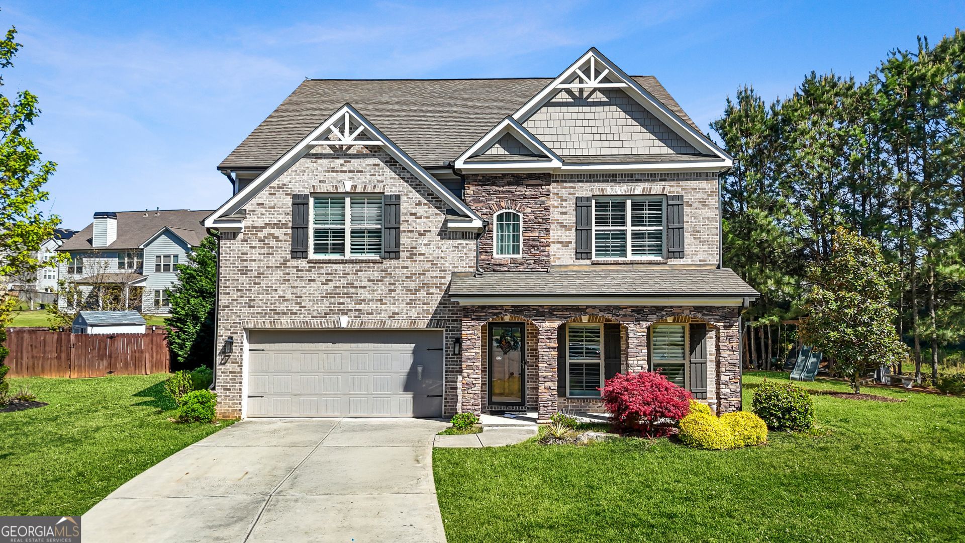 Step into this stunning dream home, located in the sought-after Ashford Crossing community. This home is perfectly positioned on a level cul-de-sac lot that offers both privacy and charm. From the moment you step into the dramatic two-story foyer, you're greeted by floor-to-ceiling custom square-paneled walls and rich 5 hardwood floors that set the tone for the elegance found throughout. Designed with both style and function in mind, this energy-efficient 4-bedroom, 4-bath home is filled with high-end upgrades at every turn. A private office with French doors and classic wainscoting creates the ideal work from home retreat, while 9-foot ceilings on both levels and a full bath on the main floor add convenience and openness. At the heart of the home, the expansive chef's kitchen is truly a showstopper, featuring 42 Aristocraft cabinetry, granite countertops, under-cabinet lighting, a butler's pantry with glass front cabinets, and an oversized island perfect for gathering. Outfitted with GE stainless steel appliances, including double wall gas ovens, a vented gas cooktop, and a French door refrigerator. This space is built for both everyday living and entertaining. The open concept layout flows seamlessly into a spacious dining area and an inviting family room, where coffered ceilings and a beautifully white washed stacked stone fireplace with gas logs create a warm, sophisticated ambiance. Upstairs, the oversized primary suite is a true retreat, complete with tray ceilings, abundant natural light, and a cozy sitting area. The spa like en suite bath features dual vanities, a soaking tub, and a tiled glass enclosed shower, along with an impressive walk-in closet. Generously sized secondary bedrooms and a versatile bonus/playroom with custom built-ins and in-wall speaker wiring provide flexible living space for any lifestyle. Throughout the home, custom 4 plantation shutters and an abundance of windows flood every room with natural light. Step outside to your private backyard oasis, complete with a screened-in patio, designer fan, extended flagstone patio with fire pit, lush landscaping, and a dedicated play area. In the backyard, a custom-built shed, complete with electricity and air conditioning offers the perfect flex space for a private office, man cave, gym, studio, or creative retreat. The garage is equipped with a 220V outlet, perfect for electric vehicle owners. Beyond the home itself, Sugar Hill continues to evolve into a premier destination, with exciting new growth, a thriving downtown, and thoughtfully planned developments that enhances both lifestyle and long-term value. Ideally located just minutes from GA-400, I-85, shopping, dining, the Mall of Georgia, and Lake Lanier, this exceptional property offers the perfect blend of luxury, comfort, and convenience.
