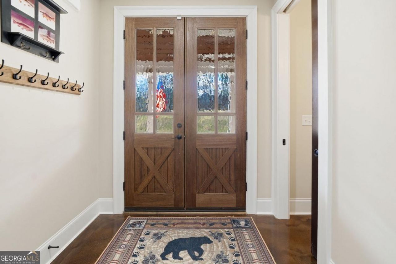 Tucked away in the rolling countryside of Ball Ground in Cherokee County-an area celebrated for its blend of small-town charm, scenic landscapes, and convenient access to metro Atlanta-this spectacular custom-built, all-brick estate offers an exceptional retreat on 14.64 private acres. Designed with both style and substance in mind, the home showcases polished concrete floors, soaring ceilings, and striking custom light fixtures, while double-paned windows frame peaceful, panoramic views from nearly every room. The open-concept layout is anchored by an impressive vaulted great room with exposed beams and a commanding stone fireplace with an oversized hearth. The gourmet kitchen is equally notable, featuring floor-to-ceiling custom cabinetry, a generous island bar, gleaming quartzite countertops, and a professional-grade appliance package. Custom designed, through the cabinets is a hidden pantry full of shelving. A spacious dining area extends just off the kitchen, easily accommodating gatherings of six or more, while a thoughtfully designed mudroom/laundry space with a folding center enhances everyday functionality. Speaking of functionality, an additional secret hideaway can be found just opposite the unassuming built-in shelves and connects to the owner's suite creating a perfect storage space. The primary suite serves as a private sanctuary with direct access to its own porch and a sliding barn door opening to a spa-inspired bath featuring dual custom vanities, tile flooring, and a frameless shower with dual rain heads. It's evident no expense was spared. Additionally, you can find a secondary bedroom suite accompanied by a private full bath, perfect for guests or in-laws. Upstairs two additional bedrooms and a well-appointed full bath provide comfortable accommodations. Efficiency meets durability with three HVAC heat pump systems, a gas instant hot water heater, and a long-lasting metal roof. Outdoor living is equally captivating, offering a classic rocking chair front porch, a wrap-around screened porch with sweeping territorial views, and a saltwater pool with an expansive patio-creating the ultimate setting for both quiet relaxation and entertaining. The property also features an oversized shop ideal for tractors, lawn equipment, ATVs, and more, along with a dedicated garden area ready for cultivation. With an underground spring-fed creek, abundant wildlife and frequent deer sightings, this spectacular setting truly is a hunter's paradise. A rare blend of privacy, acreage, and custom craftsmanship, this property delivers a refined Southern lifestyle without sacrificing quality, amenities or convenience.